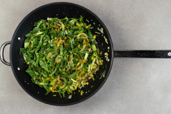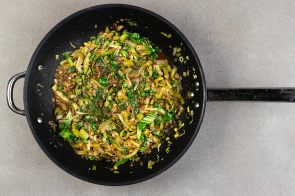 Die Knoblauch-Ingwer-Paste in zwei großen Pfannen mit je 1EL Pflanzenöl bei mittlerer Hitze ca. 30Sek. erwärmen. Den Lauch, die weißen Pak-Choi-Streifen, die Hoisin- und die Sojasauce auf die Pfannen verteilen und je 70ml Wasser hinzufügen. Abgedeckt 2–3Min. köcheln, bis das Gemüse weich ist. Den übrigen Pak Choi zugeben und weitere ca. 2Min. abgedeckt köcheln.