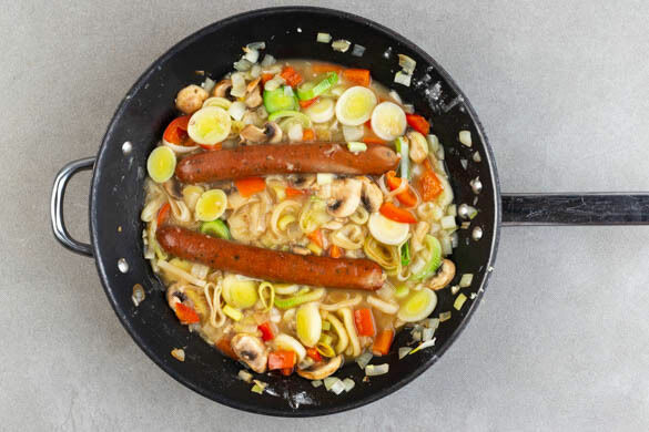 Das Brühgewürz in 400ml warmem Wasser auflösen. Den Knoblauch und die Würste in die Pfanne zu dem Gemüse geben und ca. 1Min. anbraten. Mit 2EL Mehl bestäuben, dann die Brühe angießen und gut verrühren.