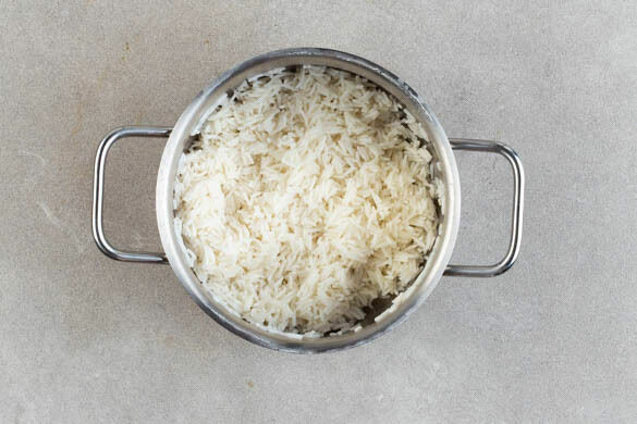 In einem kleinen Topf 300ml leicht gesalzenes Wasser zum Kochen bringen. Den Reis in einem Sieb kalt abspülen, bis das Wasser klar bleibt. Sobald das Wasser kocht, den Reis hineingeben und abgedeckt bei niedrigster Hitze 12–14Min. kochen, bis das Wasser aufgesogen und der Reis gar ist. Noch ca. 5Min. ohne Hitzezufuhr ziehen lassen.