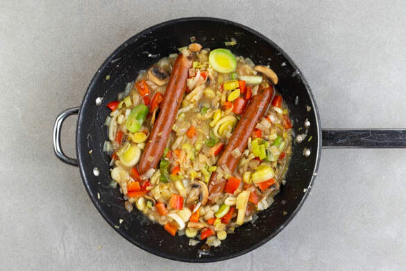 Die 1/2 des Brühgewürzes in 200ml warmem Wasser auflösen. Den Knoblauch und die Würste in die Pfanne zu dem Gemüse geben und ca. 1Min. anbraten. Mit 1EL Mehl bestäuben, dann die Brühe angießen und gut verrühren.