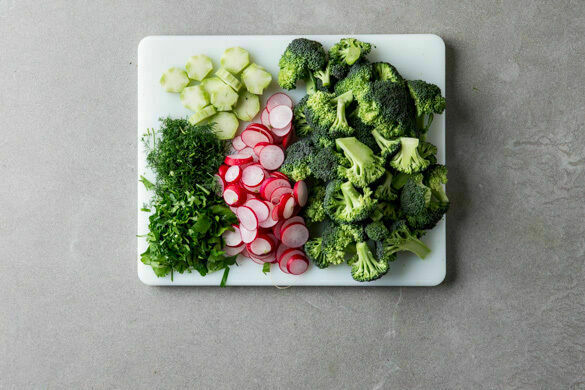 Den Backofen auf 220°C (200°C Umluft) vorheizen. In einem mittelgroßen Topf 800ml Wasser mit dem Brühgewürz zum Kochen bringen. Den Brokkoli in mundgerechte Röschen und den Strunk in dünne Scheiben schneiden. Die Radieschen ebenfalls in dünne Scheiben schneiden. Die Kräuter samt Stängeln fein schneiden.