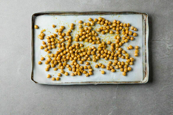 Die Kichererbsen in einem Sieb kalt abspülen und abtropfen lassen. Dann auf einem mit Backpapier ausgelegten Backblech mit der ½ des Currypulvers, 2EL Olivenöl und je ½TL Salz und Pfeffer vermengen, gleichmäßig verteilen und ca. 10Min. im Ofen rösten.