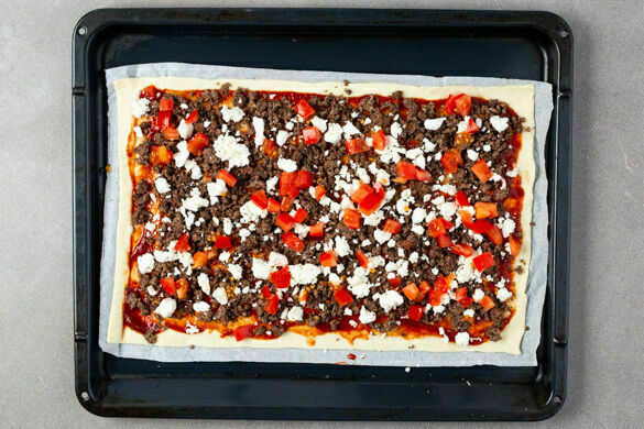 Ob Sonnenbaden auf Samos, Sightseeing in Athen oder Partymachen auf Mykonos – Griechenland hat für jeden was zu bieten! Inspiriert von wehmütigen Erinnerungen an heiße Tage und lustige Nächte landet heute diese Köstlichkeit auf deinem Teller: knuspriger Flammkuchenteig getoppt mit saftigem Rinderhack und würzigem Feta. Dazu ein Salat aus knackiger Paprika, pikanten Oliven und erfrischender Gurke. Mmmh, so schmeckt Urlaub!