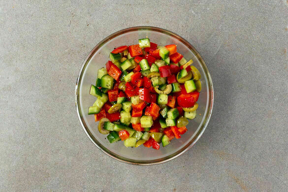 Die Gurke in kleine Würfel schneiden. Die Paprika vierteln, entkernen und in kleine Würfel schneiden. Die Oliven in Ringe schneiden und mit der Gurke und der Paprika vermengen. 2EL Olivenöl und 2EL Essig unterrühren und den Salat mit je ½TL Salz und Pfeffer würzen.
