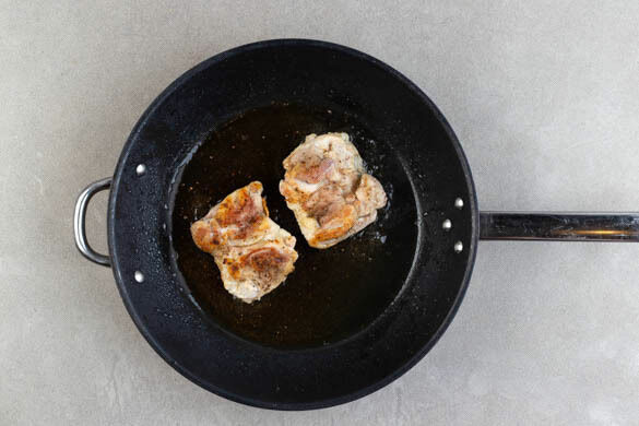 Das Fleisch trocken tupfen, großzügig mit Salz und Pfeffer würzen und in einer mittelgroßen Pfanne mit 1EL Olivenöl bei mittlerer bis starker Hitze auf jeder Seite 3–5Min. goldbraun anbraten. Die Pfanne vom Herd nehmen, das Fleisch etwas abkühlen lassen, in Tranchen schneiden und zurück in die Pfanne geben.