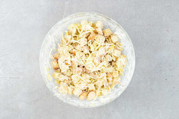 Den Lauch in einer mittelgroßen Pfanne mit 1EL Olivenöl und 1 Prise Salz bei mittlerer Hitze 3–4Min. anbraten. Die Croûtons mit dem Lauch, der Crème fraîche und dem Käse vermengen und die Füllung mit Salz und Pfeffer abschmecken. Die Pfanne auswischen.