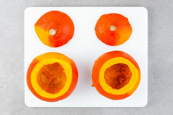 Den Backofen auf 240°C (220°C Umluft) vorheizen. Von den Kürbissen einen kleinen Deckel abschneiden und die Kerne sowie das faserige Fruchtfleisch mit einem Löffel entfernen. Den Boden etwas begradigen, sodass die Kürbisse gut stehen, dann die Kürbisse und die Deckel auf ein mit Backpapier ausgelegtes Backblech legen und direkt in den vorheizenden Ofen geben.