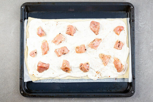 Den Teig mit dem Papier nach unten auf einem Backblech ausrollen und gleichmäßig mit der Limettencreme bestreichen. Das Fleisch darauf verteilen und den Flammkuchen 10–12Min. im Ofen backen.