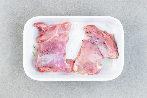 Das Fleisch trocken tupfen und mit 1E Olivenöl sowie je 1 Prise Salz und Pfeffer einreiben. In einer Auflaufform 20–25Min. im Ofen backen, bis das Fleisch gar ist.