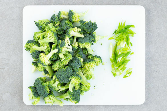 Den Backofen auf 240°C (220°C Umluft) vorheizen. In einem mittelgroßen Topf ausreichend gesalzenes Wasser für die Pasta zum Kochen bringen. Den Brokkoli in ca. 2cm große Stücke schneiden. Die Lauchzwiebel schräg in feine Ringe schneiden.