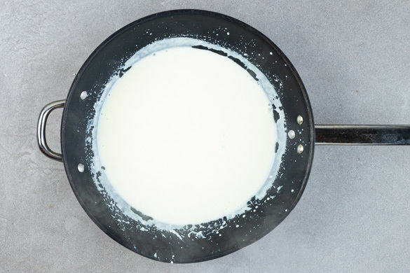 Die Crème fraîche in einer großen Pfanne mit 250ml Wasser und der ½ des Brühgewürzes verrühren, dann bei mittlerer Hitze langsam zum Kochen bringen.