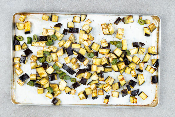 Den Backofen auf 220°C (200°C Umluft) vorheizen. Die Aubergine in 2–3cm große Würfel schneiden, mit 1EL Olivenöl sowie je 1 kräftigen Prise Salz und Pfeffer vermengen und auf einem mit Backpapier ausgelegten Backblech 17–20Min. im Ofen weich rösten.