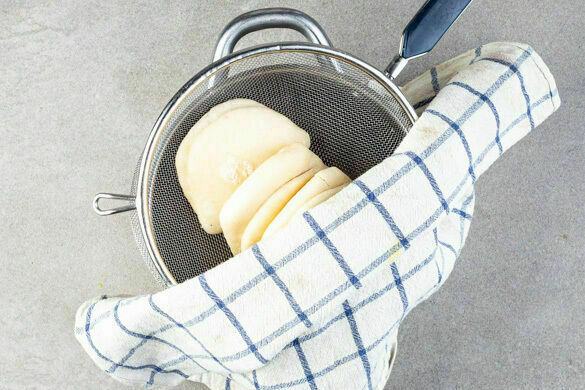 Das Fleisch trocken tupfen, auf den Boden des Dampfgarers (oder Topfes, siehe Tipp) geben und mit ausreichend Wasser bedeckt zum Kochen bringen. Den Dampfbehälter mit etwas Backpapier auflegen. Die Brötchen hineingeben, ca. 7Min. abgedeckt dämpfen und aus dem Behälter nehmen. Das Fleisch in weiteren 2–3Min. gar kochen, dann herausnehmen und abkühlen lassen. Vorsicht: Heißer Dampf!