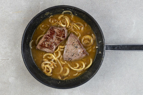 Die restlichen Zwiebeln in der Pfanne mit 1–2EL Öl bei mittlerer Hitze 5–6Min. goldbraun anbraten. Mit 1EL Mehl bestäuben und mit 400–450ml Wasser ablöschen, dann das restliche Brühgewürz unterrühren und die Sauce 3–4Min. bei mittlerer Hitze einköcheln lassen. Mit Pfeffer und 1–2TL Worcestershiresauce abschmecken. Das Fleisch bis zum Servieren in der Sauce ziehen lassen.