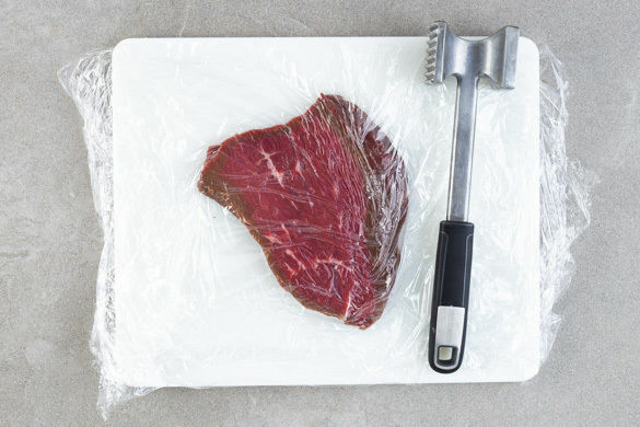 Das Fleisch mit etwas Küchenkrepp trocken tupfen und zwischen Klarsichtfolie 1–2cm dünn plattieren. Tipp: Wer keinen Fleischklopfer hat, kann dafür auch eine schwere Pfanne verwenden. Das Fleisch anschließend in 2 gleich große Stücke schneiden und mit Salz und Pfeffer würzen.