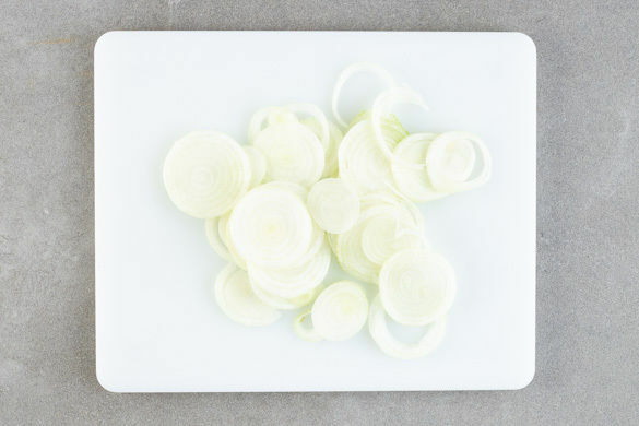Die Zwiebeln schälen und in dünne Ringe schneiden.