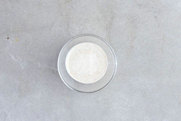 Das Tahini mit 2EL Mayonnaise, 1EL Wasser und 1TL Essig verrühren. Den Dip mit Salz und Pfeffer abschmecken.