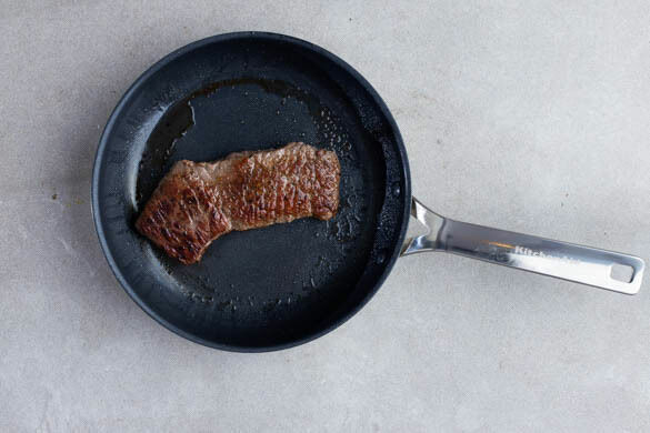 Das Fleisch trocken tupfen, mit je 1 Prise Salz und Pfeffer würzen und in derselben Pfanne mit 1EL Olivenöl bei starker Hitze auf jeder Seite 2–3Min. braten, abhängig davon, ob es medium oder eher durchgebraten sein soll. Aus der Pfanne nehmen und bis zum Servieren auf einem Teller abgedeckt ruhen lassen.