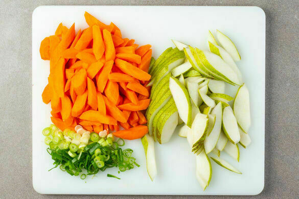 Die Karotten ggf. schälen, der Länge nach halbieren und schräg in dünne Scheiben schneiden. Die Birnen vierteln, den Strunk und das Kerngehäuse entfernen, dann der Länge nach in ca. 0,5cm dünne Scheiben schneiden. Die Lauchzwiebeln in feine Ringe schneiden.
