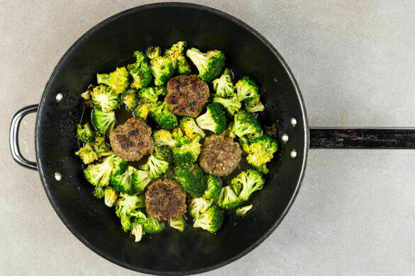 Die Hackbällchen herausnehmen, dann den Brokkoli in die Pfanne geben und bei mittlerer Hitze ca. 2Min. anbraten, dabei gelegentlich rühren.
