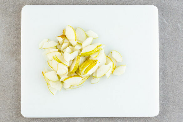 Den Backofen auf 190°C (170°C Umluft) vorheizen. In einem großen Topf ausreichend gesalzenes Wasser für die Pasta zum Kochen bringen. Den Brokkoli samt Strunk in mundgerechte Stücke schneiden. Die Zwiebeln schälen, halbieren und fein würfeln. Die Birnen vierteln, entkernen und in ca. 0,5cm dünne Scheiben schneiden.