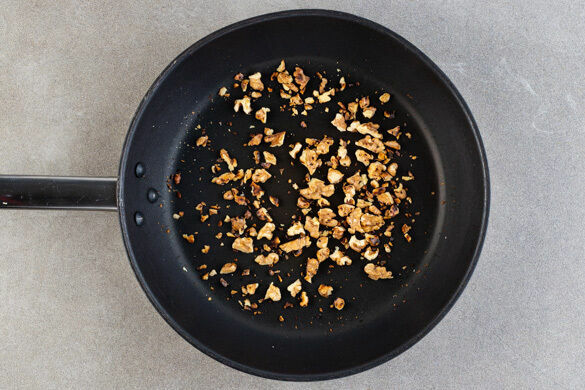 Die Walnüsse grob hacken und in einer großen Pfanne ohne Zugabe von Fett bei mittlerer Hitze 1–2Min. anrösten. Vorsicht, sie können schnell zu dunkel werden. Zum Abkühlen aus der Pfanne nehmen und beiseitestellen.
