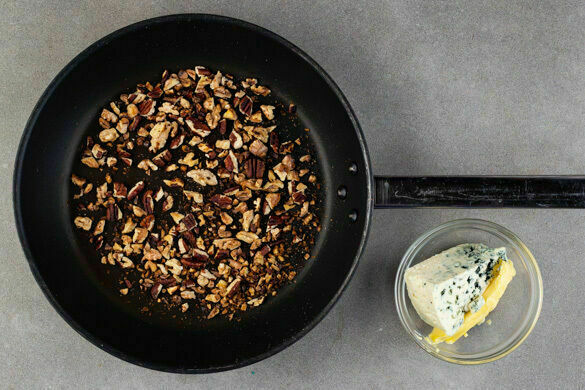 Den Backofen auf 220°C (200°C Umluft) vorheizen. Den Käse und 1EL Butter in ein kleines Schälchen geben und Raumtemperatur annehmen lassen. Die Walnüsse und die Pekannüsse fein hacken und in einer mittelgroßen Pfanne bei mittlerer Hitze ca. 3Min. anrösten. Die Nüsse mit dem Käse, der Butter, 2EL Honig, ½TL Salz und 1 Prise Pfeffer vermengen. Die Pfanne aufbewahren.