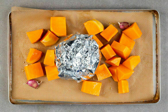 Den Kürbis schälen, halbieren und entkernen, dann in ca. 3cm große Stücke schneiden. Mit 2EL Olivenöl und 1TL Salz vermengen und nach ca. 60Min. Backzeit mit dem ungeschälten Knoblauch um den Sellerie auf dem Backblech verteilen. Den Knoblauch nach ca. 25Min. aus dem Ofen holen. Den Sellerie und den Kürbis weitere ca. 10Min. backen, bis das Gemüse sehr weich ist.