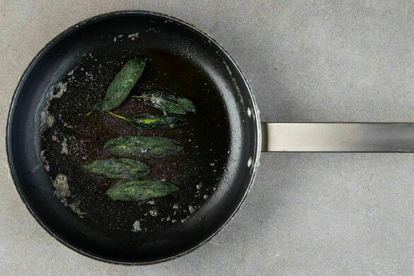 Währenddessen die Salbeiblätter abzupfen und in der Pfanne mit 2EL Butter bei mittlerer bis niedriger Hitze auf jeder Seite 3–4Min. knusprig anbraten, dabei die Salbeiblätter mit einer Gabel leicht in das heiße Fett drücken. Auf Küchenkrepp abtropfen lassen und mit 1 Prise Salz würzen. Die Salbeibutter aufbewahren.