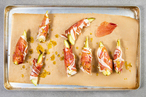 Den Schinken ggf. kleiner schneiden, dann jedes Stück Birne mit einer Scheibe Schinken umwickeln und auf einem mit Backpapier ausgelegten Backblech verteilen. Ggf. übriges Würzöl darüberträufeln. Die Birnen in Serrano 10–12Min. im Ofen backen, bis die Birnen weich sind und der Schinken knusprig ist.
