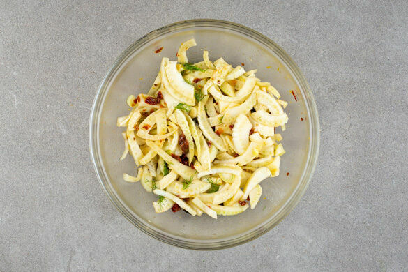 Den Fenchel jeweils längs vierteln, dann in sehr dünne Streifen schneiden, dabei den harten Strunk entfernen. Den Fenchel mit dem Dressing vermengen.