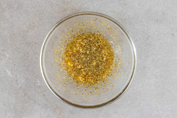Die Orangen halbieren und auspressen. 1TL Oregano und 1TL Kreuzkümmel-Koriander-Gewürzmischung vermengen. Den Knoblauch schälen, sehr fein würfeln oder durch eine Knoblauchpresse drücken und unterrühren.