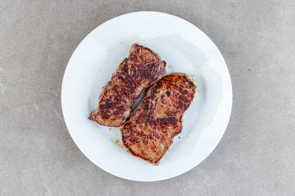 Das Fleisch trocken tupfen und in einer mittelgroßen Pfanne mit 1EL Olivenöl bei starker Hitze auf jeder Seite 2–3Min. braten, abhängig davon, ob es medium oder eher durchgebraten sein soll. Das Fleisch aus der Pfanne nehmen und abgedeckt auf einem Teller ruhen lassen. Die Pfanne wird weiterverwendet. Den Mais in dicke Scheiben schneiden.