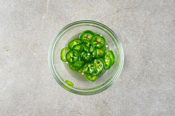 Die Chilischote in feine Ringe schneiden. Tipp: Für weniger Schärfe die Kerne entfernen. 3EL hellen Essig mit 3EL Wasser, ½TL Zucker und 1 Prise Salz verrühren, bis Zucker und Salz sich aufgelöst haben. Die Chiliringe untermengen und bis zum Servieren beiseitestellen.