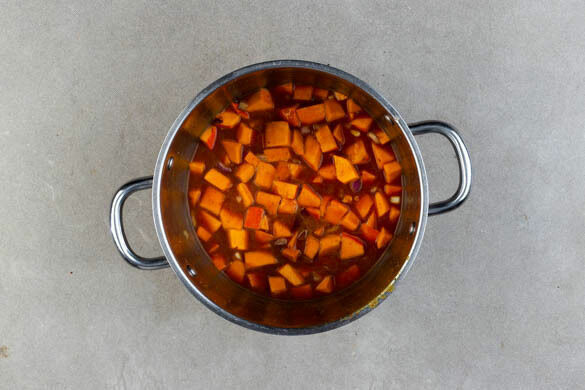 Den Kürbis, die Zwiebeln und 1TL Salz im Topf vermengen. 600ml Wasser angießen und das Tomatenmark und die restliche Gewürzmischung unterrühren. Bei mittlerer Hitze abgedeckt 12–15Min. sanft köcheln lassen, bis der Kürbis weich ist, ggf. die Hitze reduzieren.