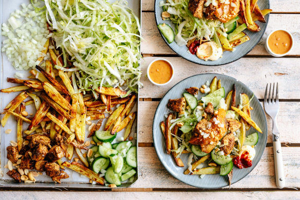 Was hier nach einem köstlich-appetitlichen Chaos aussieht, ist tatsächlich eine wohlüberlegte Komposition. Mit knusprig gebackenen Pommes, würzig-zartem Bio-Hähnchenfleisch, einer cremigen Erdnusssauce und frischem Salat und Gurke ist das Soulfood, wie es alle lieben und zum Tellerabschlecken gut! Als feines Extra streust du noch ganz nach Belieben kleine Zwiebelwürfel obendrauf. Guten Appetit!