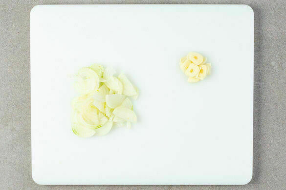 Die Zwiebeln schälen, halbieren und in dünne Streifen schneiden. Den Knoblauch schälen und in feine Scheibchen schneiden.