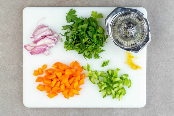 Die Karotten ggf. schälen, längs vierteln und in dünne Scheiben schneiden. Den Sellerie längs halbieren und quer in dünne Scheiben schneiden. Die Schalotten schälen, halbieren und in feine Streifen schneiden. Die Petersilie samt Stängeln grob schneiden. Die Zitronenschale abreiben, dann die Zitronen halbieren und auspressen.