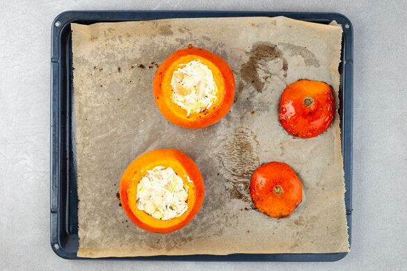 Den Backofen auf 240°C (220°C Umluft) vorheizen. Von den Kürbissen einen kleinen Deckel abschneiden und die Kerne sowie das faserige Fruchtfleisch mit einem Löffel entfernen. Den Boden etwas begradigen, sodass die Kürbisse gut stehen, dann die Kürbisse und die Deckel auf ein mit Backpapier ausgelegtes Backblech legen und direkt in den vorheizenden Ofen geben.