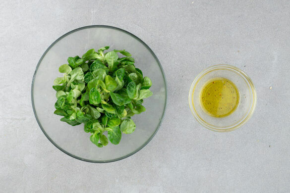 Aus 1EL Olivenöl, 1EL Essig und je 1 Prise Salz und Pfeffer ein Dressing anrühren und kurz vor dem Servieren mit dem Feldsalat und den Kürbiskernen vermengen. Die Kürbisse mit dem Salat anrichten und servieren.