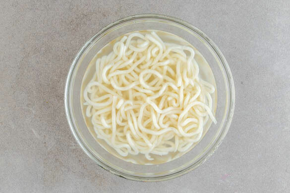 In einem Wasserkocher ausreichend Wasser für die Nudeln zum Kochen bringen. Die Nudeln mit heißem Wasser bedecken und in ca. 3Min. bissfest ziehen lassen, dabei zwischendurch umrühren, um die Nudeln voneinander zu trennen. In ein Sieb abgießen und abtropfen lassen.
