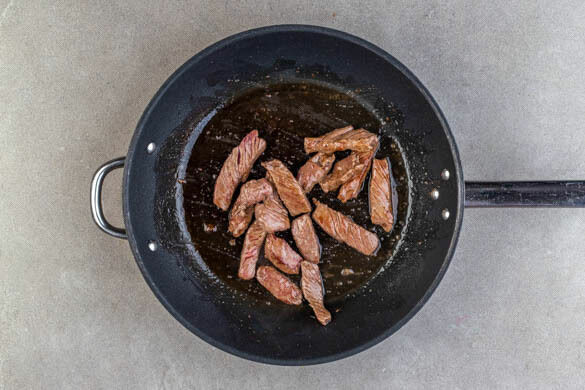 Das Fleisch trocken tupfen und in einer großen Pfanne oder einem Wok mit 1EL Pflanzenöl bei starker Hitze 2–3Min. scharf anbraten und mit ½TL Salz würzen.