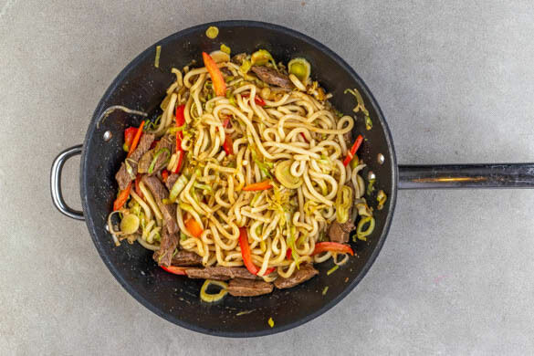 Einfacher, schneller und leckerer als heute wird es kaum noch: In nur einer Pfanne (oder einem Wok) erschaffst du blitzschnell eine asiatische Köstlichkeit, die sich in puncto umami gewaschen hat! Es gibt saftiges Rindfleisch, geschmeidige Udon-Nudeln und einen knackig-bunten Gemüsemix – alles fein gewürzt mit Teriyakisauce und gekrönt von aromatisch-deftigen Röstzwiebeln. Jetzt schnell kochen und genießen!