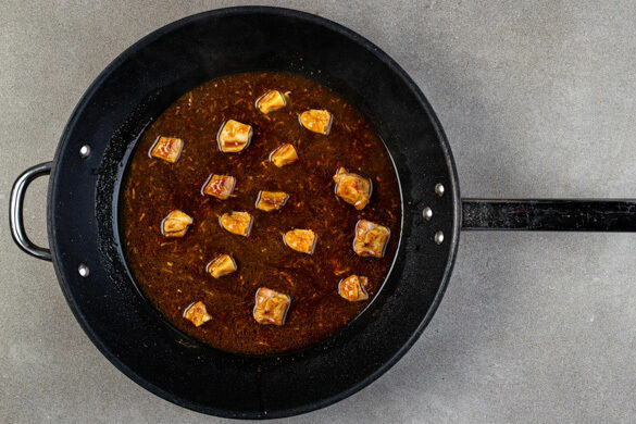 In einem zweiten kleinen Topf ausreichend Wasser für die Kaiserschoten zum Kochen bringen. Das Fleisch trocken tupfen, in 2–3cm große Würfel schneiden und in einer mittelgroßen Pfanne mit 1EL Pflanzenöl bei mittlerer Hitze in 3–5Min. von allen Seiten goldbraun anbraten, dabei nicht zu oft umrühren.