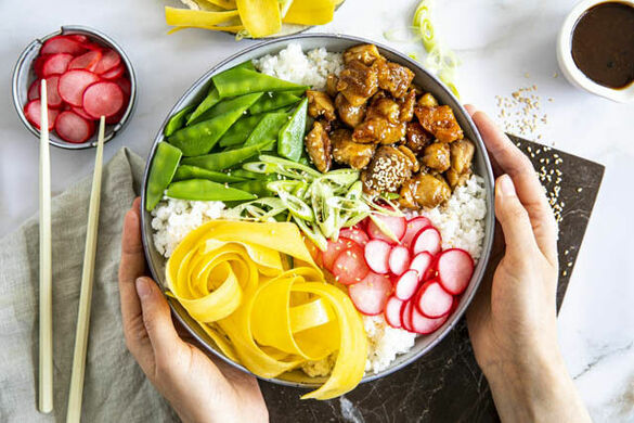 Bunt und gesund, damit liegst du immer richtig. Zum leckeren Sushireis gibt es heute saftige Hähnchenwürfel, die mit Hoisinsauce gegart werden, hauchfeine gelbe Karottenstreifen, Radieschenscheiben und knackige Kaiserschoten. Lauchzwiebel und Sesam runden die feine Asia-Bowl ab. Lass es dir schmecken!