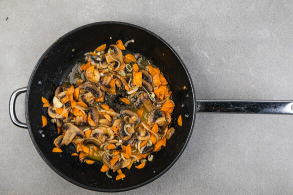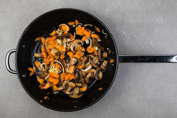 Die Karotte ggf. schälen, längs halbieren und quer in dünne Scheiben schneiden. Die Zwiebel schälen, halbieren und grob würfeln. Beides in einer großen Pfanne mit 2–3EL Olivenöl oder Butter bei mittlerer Hitze 4–5Min. braten, bis das Gemüse weich wird. Die Pilze ggf. säubern, in dünne Scheiben schneiden und unter häufigem Rühren 7–8Min. mitbraten, bis sie appetitlich bräunen.