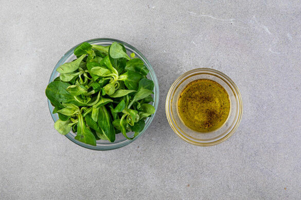Aus 1EL Olivenöl, 1–2TL hellem Essig sowie je 1 Prise Salz und Pfeffer ein Dressing anrühren und kurz vor dem Servieren mit dem Salat vermengen. Den Flammkuchen mit dem restlichen Schnittlauch garnieren und mit dem Salat servieren.