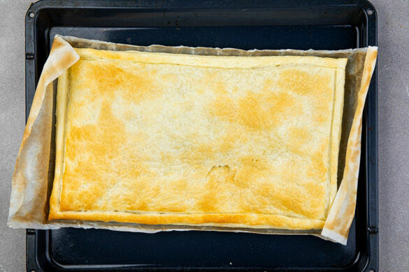 Den Teig mit dem Papier nach unten auf einem Backblech ausrollen. Mit einer Messerspitze rundum einen ca. 1cm breiten Rand einzeichnen und die innenliegende Fläche gleichmäßig einstechen. Den Teig auf der unteren Schiene ca. 12Min. vorbacken.
