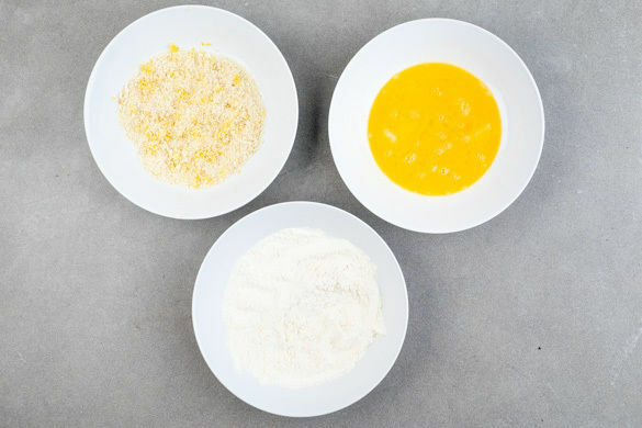 Für die Panade 3–4EL Mehl auf einen tiefen Teller geben. Auf einem weiteren Teller 1 Ei mit dem restlichen Knoblauch verquirlen. Das Panko-Paniermehl auf einen dritten Teller geben und mit 1–2EL Zitronenschale vermengen. Das Fleisch trocken tupfen, einmal waagerecht und quer halbieren und die 4 Stücke zwischen Frischhaltefolie ca. 0,5cm dünn plattieren.