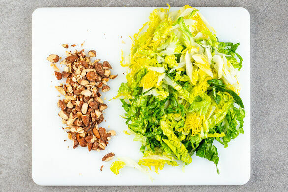 Den Salat in ca. 1cm breite Streifen schneiden. Die Rauchmandeln grob hacken.